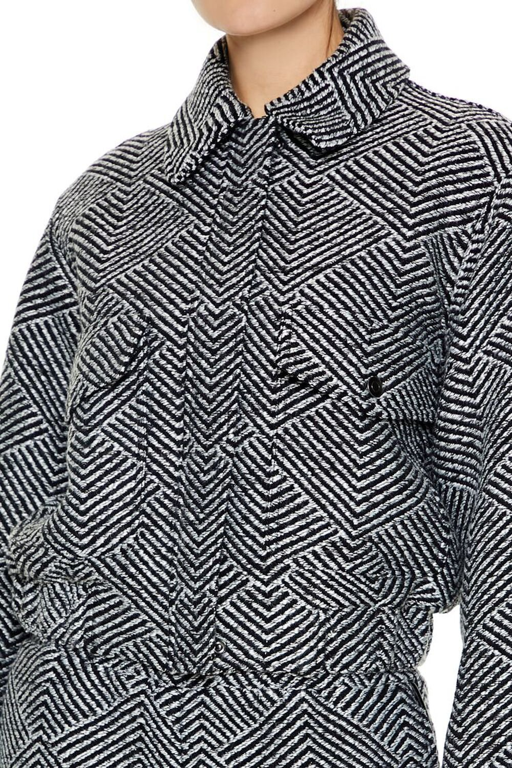 A woven jacket featuring an allover chevron pattern, chest flap pockets, long sleeves, and a basic collar.