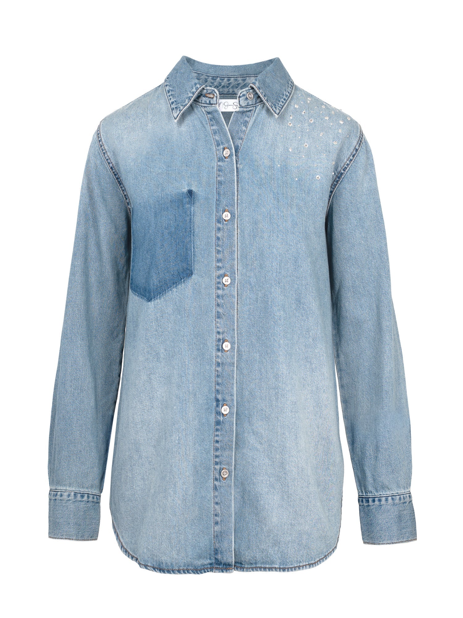 - Features: Embellished yoke with rhinestones; contrast denim accents; curved shirttail hem